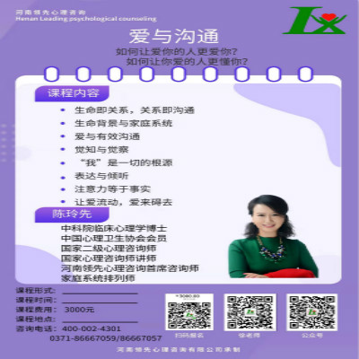 河南领先心理咨询公司,是一家创办较早、心理咨询效果显著的权威心理咨询机构,由郑州锡安山心理健康咨询公司发展而来,2013年更名为河南领先心理咨询有限公司,是一家拥有权威心理咨询专家团队、专业心理咨询机构。公司以婚姻、亲子为中心,面向全国专业开展情感咨询、情感修复、婚姻挽救和青少年厌学、早恋、网瘾、叛逆及失眠、焦虑、抑郁、自闭、社交恐惧、人际关系不良等方面心理咨询的专业心理机构,专业进行恋爱关系、夫妻关系、家庭关系和父母角色教育、亲子教育、亲子关系、青少年性心理、性健康...【查看详细】